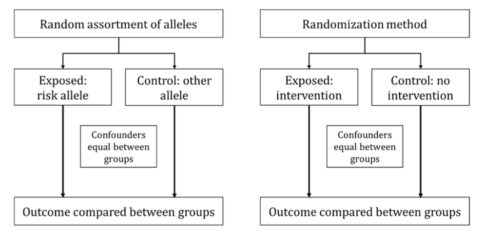 在随机对照实验上,我们通过随机、盲法、对照试验,保证组间的可比性,以消除不同个体差异的干扰;而在孟德尔随机化中我们认为等位基因的分配就是一个天然的随机过程,所以如果我们找到了影响暴露的等位基因,此时我们选择不同基因型的个体进行比较就可以直接得到暴露所造成的效果。