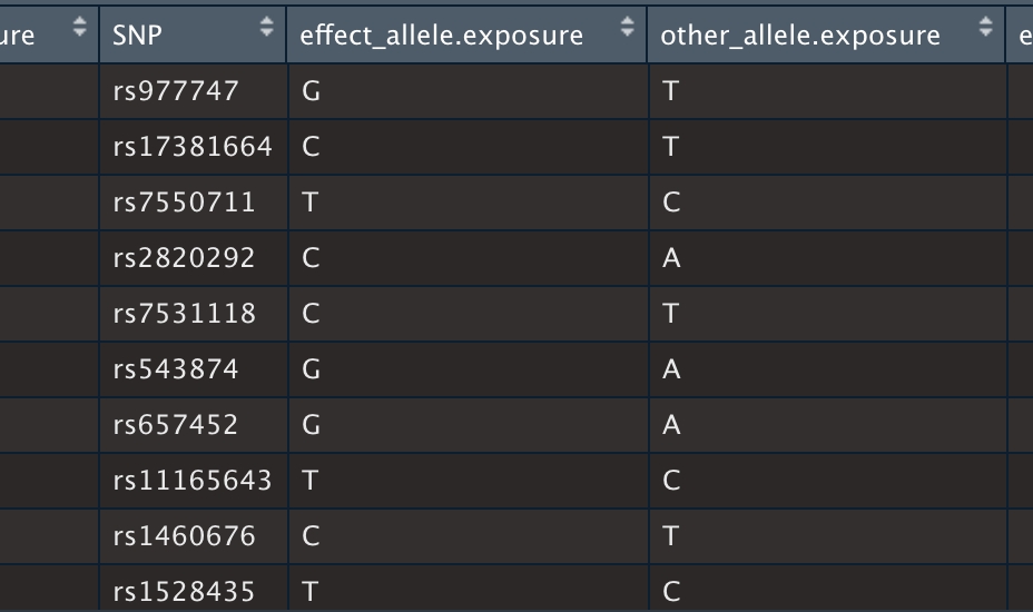 chd_out_dat <- extract_outcome_data(snps = bmi_exp_dat$SNP, outcomes = 'ieu-a-7')